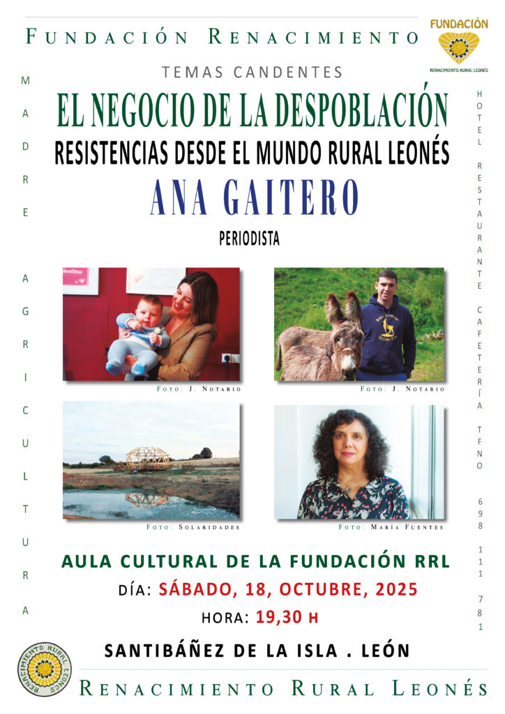 La Fundación Renacimiento Rural Leonés acogerá el próximo sábado, 18 de octubre de 2025, a las 19:30 h, una nueva sesión dentro de su ciclo Temas Candentes, con la conferencia titulada “El negocio de la despoblación. Resistencias desde el mundo rural leonés”, impartida por la reconocida periodista Ana Gaitero.
