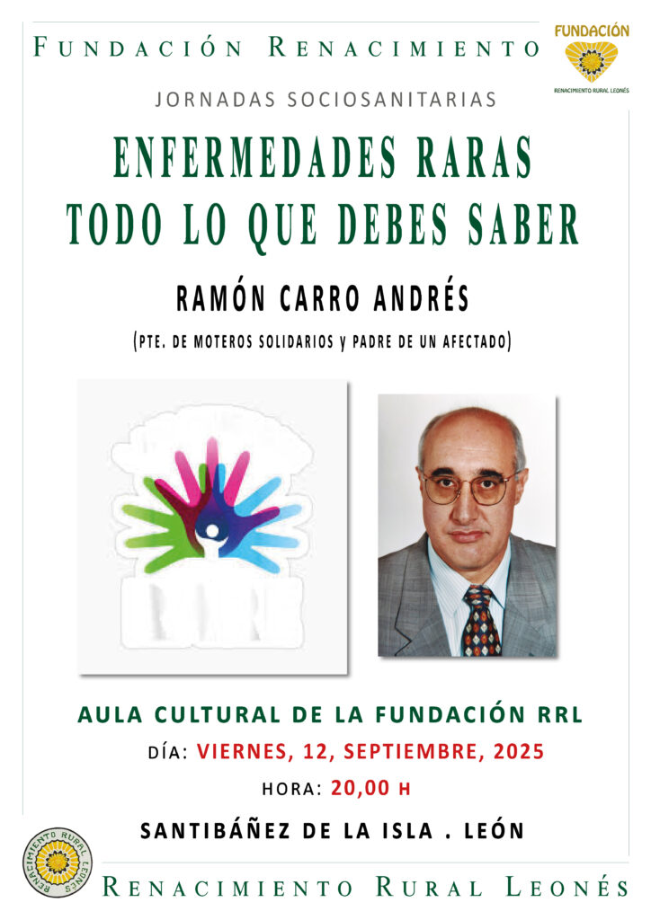 📍Santibáñez de la Isla (León), septiembre de 2025 — La Fundación Renacimiento Rural Leonés acogerá el próximo viernes 12 de septiembre, a las 20:00 horas, una nueva jornada sociosanitaria bajo el título: “Enfermedades raras: todo lo que debes saber”, impartida por Ramón Carro Andrés, presidente de la asociación Moteros Solidarios y padre de un afectado.