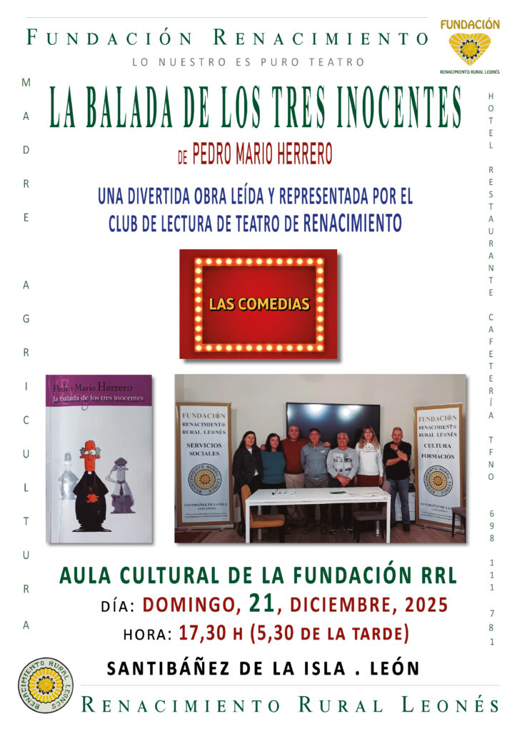 La Fundación Renacimiento Rural Leonés continúa ampliando su programación cultural con el estreno público del Club de Lecturas Teatrales “Las Comedias”, que ofrecerá una lectura representada de la obra La balada de los tres inocentes, del dramaturgo Pedro Mario Herrero.