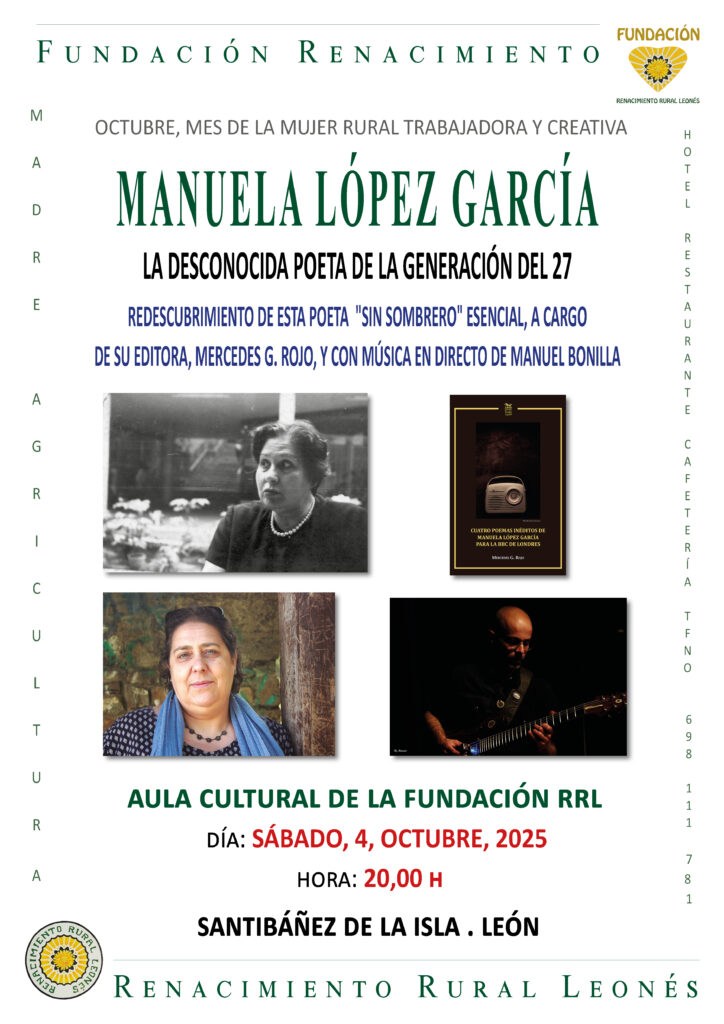 La primera protagonista será Manuela López García, poeta nacida en Cacabelos, coetánea de los grandes autores de la Generación del 27 y reconocida actualmente como una de las integrantes del grupo de creadoras conocido como “Las Sin Sombrero”, cuya obra comienza a ocupar el lugar que merece dentro de la historia literaria.