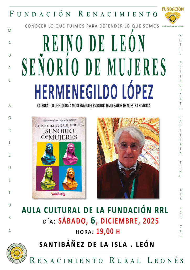 La Fundación Renacimiento Rural Leonés se complace en anunciar una nueva cita cultural de gran relevancia histórica. El próximo sábado 6 de diciembre de 2025, a las 19:00 horas, el Aula Cultural de Santibáñez de la Isla acogerá la conferencia “Reino de León. Señorío de Mujeres”, impartida por D. Hermenegildo López González, una de las figuras académicas más destacadas del ámbito leonés.