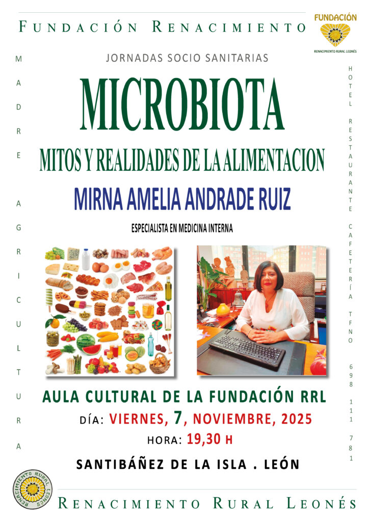 El próximo viernes 7 de noviembre de 2025 a las 19:30 horas, la Fundación Renacimiento Rural Leonés continuará con sus Jornadas Socio-Sanitarias en el Aula Cultural de Santibáñez de la Isla. En esta ocasión, la conferencia “Microbiota: mitos y realidades de la alimentación” será impartida por la Dra. Mirna Amelia Andrade Ruiz, especialista en Medicina Interna.