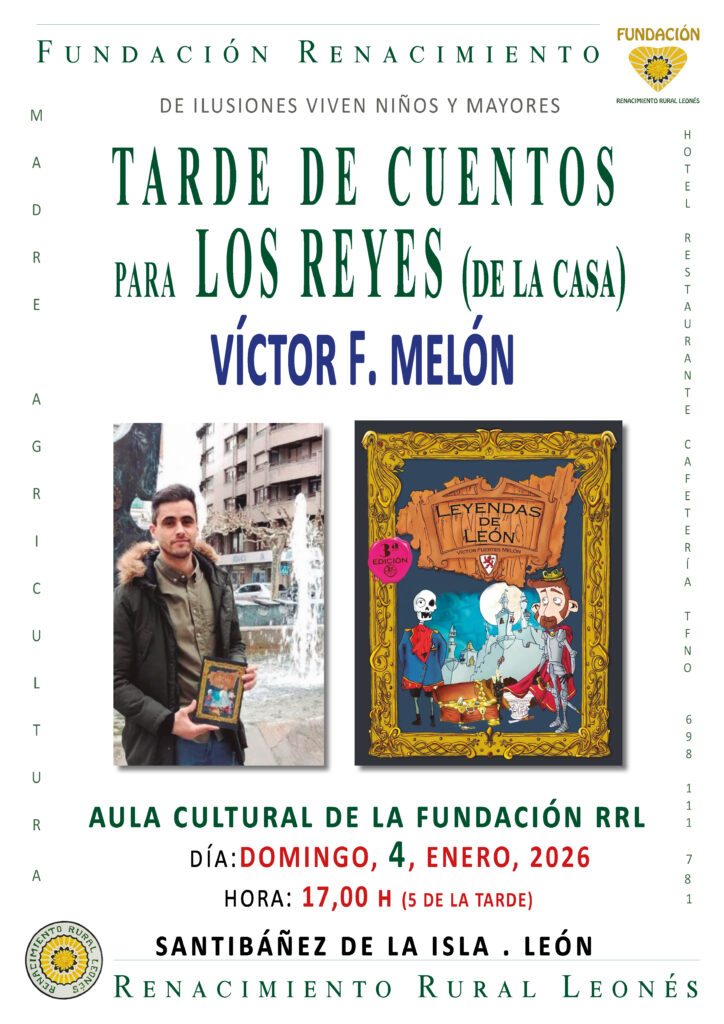El domingo 4 de enero, a las 17:00 horas, el Aula Cultural de la Fundación Renacimiento Rural Leonés, en Santibáñez de la Isla, acogerá la actividad “Tarde de cuentos para los Reyes (de la casa)”, a cargo del autor leonés Víctor Fuertes Melón. Una sesión de narración en la que las leyendas y relatos de León se convierten en protagonistas para despertar la imaginación de niños y jóvenes en vísperas de la festividad de Reyes.